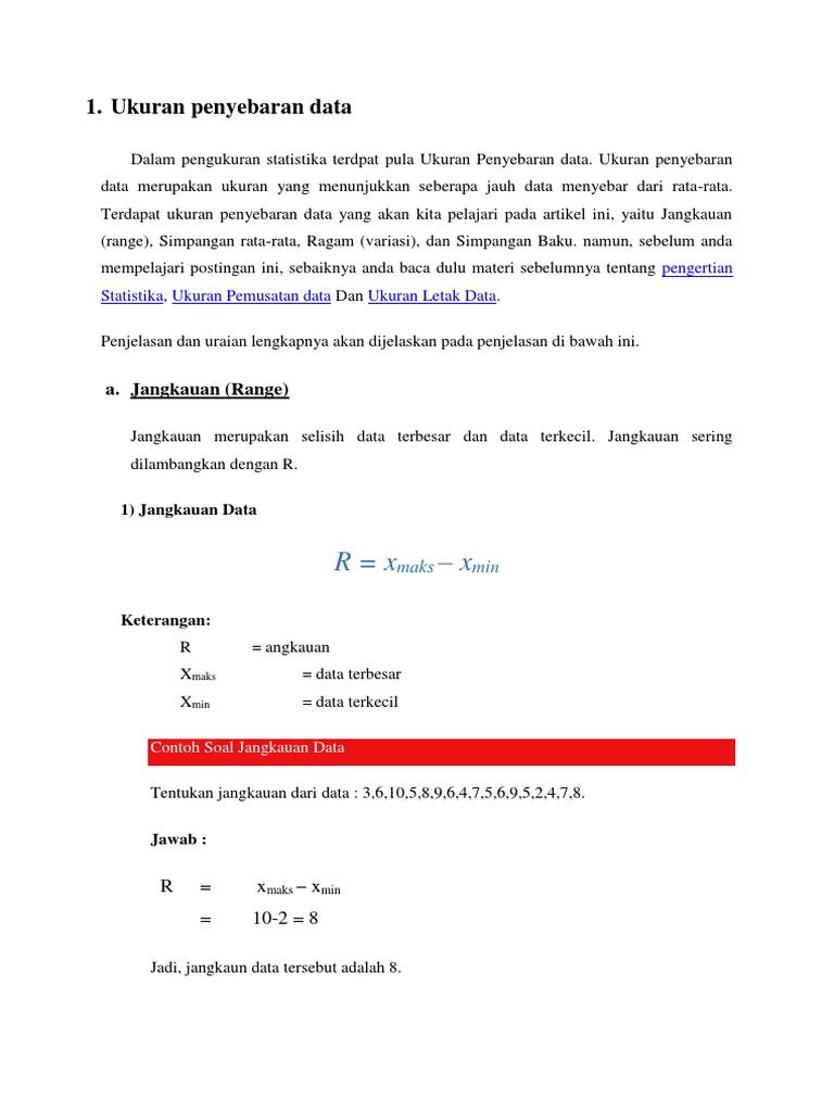 Contoh soal penghitungan modus. Demikianlah ulasan dari Seputarpengetahuancoid tentang Ukuran Penyebaran Data semoga dapat menambah wawasan dan pengetahuan kalian. Ukuran Pemusatan data Ukuran Pemusatan data yaitu suatu nilai tunggal yang mewakili suatu kumpulan data dan menunjukkan karakteristik dari data tersebut Ukuran penyebaran data Ukuran Penyebaran adalah suatu ukuran untuk mengetahui seberapa jauh penyebaran data.