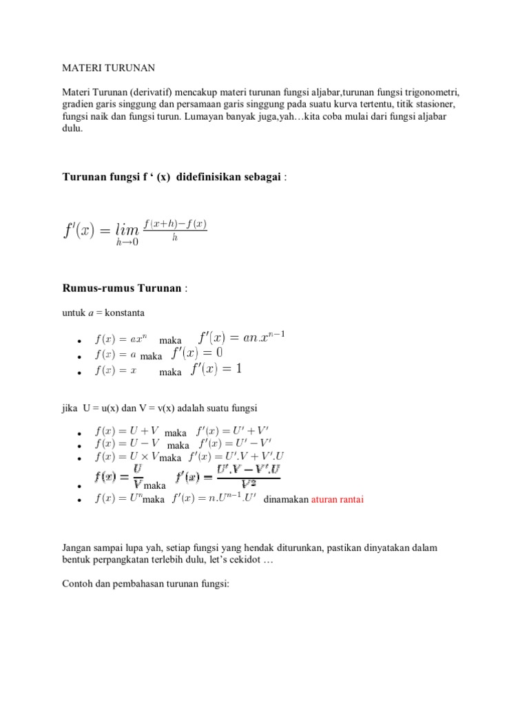 Materi Turunan diajarkan pada tingkat SMA kelas 11. Maka nilai dari f. Sebelum masuk dalam soal dan pembahasannya beberapa rumus di bawah ini harus dipahami guna mempermudah anda dalam penyelesaian soalnya.